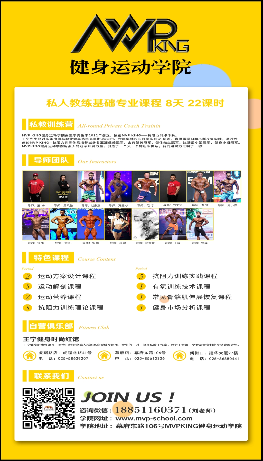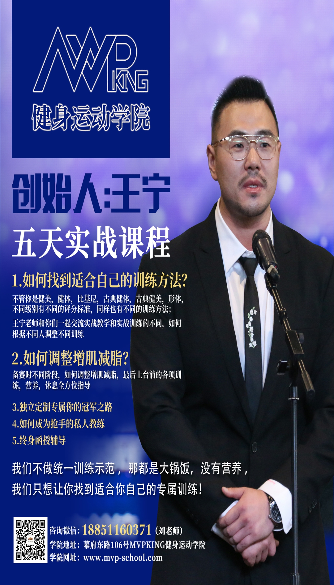 MVP-KING健身运动学院由王宁先生于2012年创立,独创了MVP-KING抗阻力训练体系。王宁先生经过多年出国与职业健美选手克里斯.科米尔先生;六届奥林匹亚冠军多利安.耶茨先生及奥林匹亚最匀称先生肖恩.雷学习,和不断反复实践,通过独创的MVP-KING抗阻力,训练体系,培养出多名亚洲健美冠军、古典健美冠军、健体先生冠军、比基尼小姐冠军及健身小姐冠军。MVP-KING健身运动学院用强大的冠军师资力量创造了一个又一个的冠军神话.